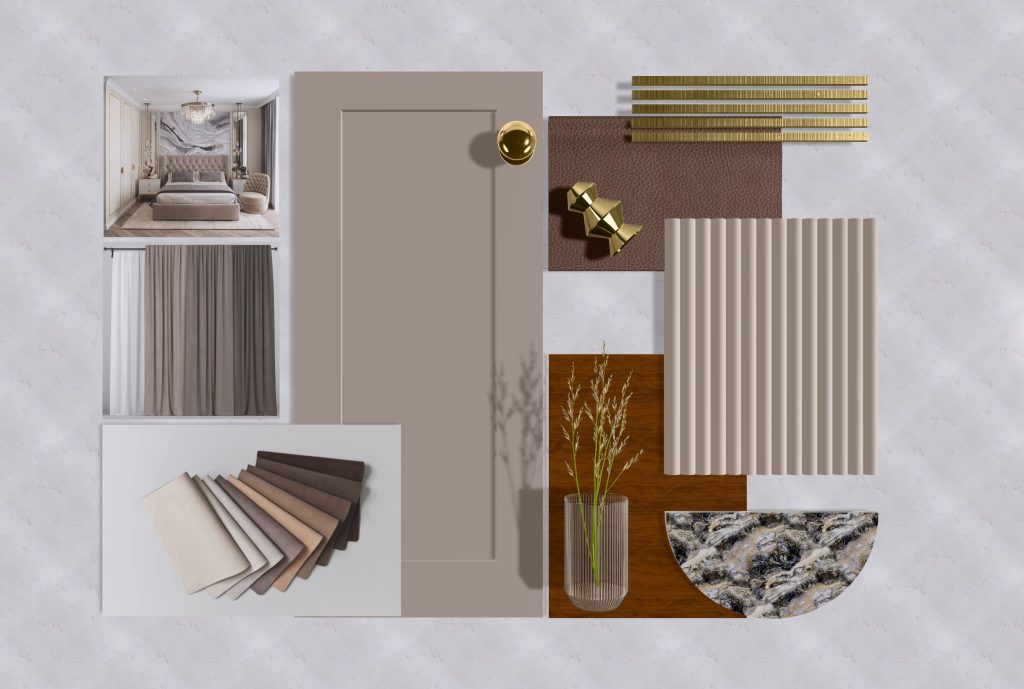 The interior design is defined by a soft dusty-rose and beige color palette, creating a warm and harmonious atmosphere. Carefully selected materials, textures, and lighting contribute to a modern and sophisticated bedroom environment.