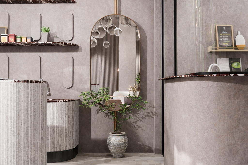 Premium materials such as natural stone, marble, warm wood, and soft textiles create a sense of understated luxury, while a neutral color palette of beige, grey, and earthy tones provides a calm visual backdrop for coffee rituals, food, and social moments.