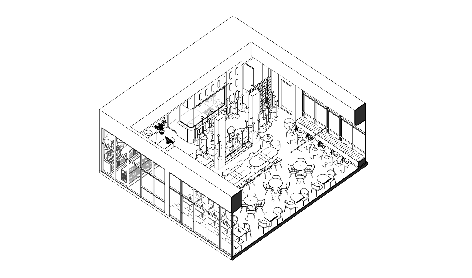 The layout offers multiple seating zones for different experiences—from quick coffees to relaxed conversations and informal meetings. Integrated greenery brings freshness and balance, strengthening the connection between interior and exterior spaces.