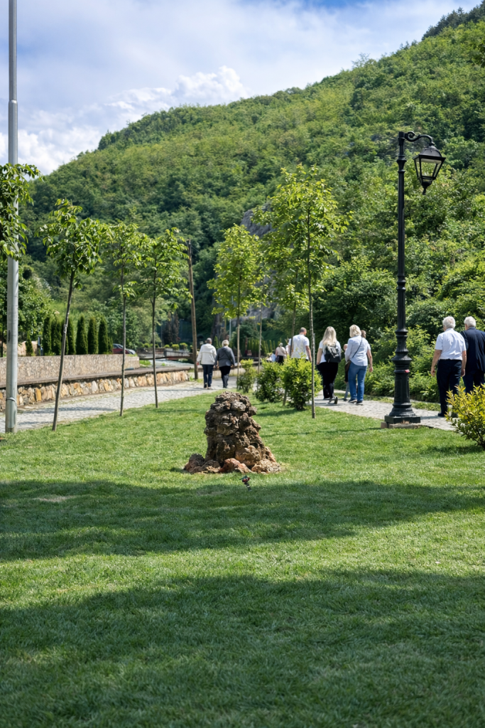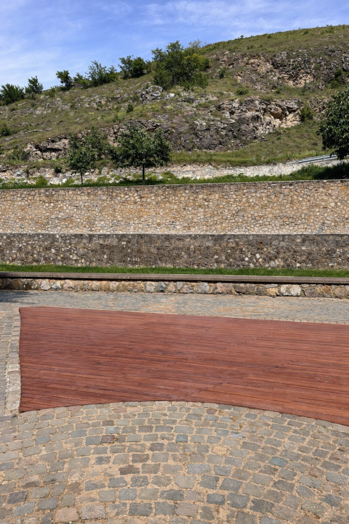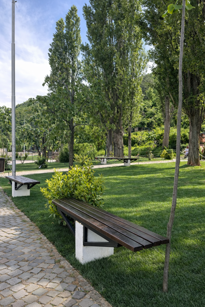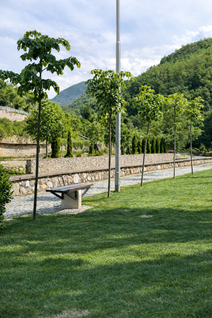 Materiality plays a central role in ensuring durability and long-term performance. Contemporary, high-quality finishes were selected to withstand intensive public use while maintaining architectural clarity. The adjacent ramp, designed fully in accordance with administrative regulations, is marked in blue — a subtle chromatic reference to the Lumbardhi River — establishing a symbolic dialogue between infrastructure and landscape.