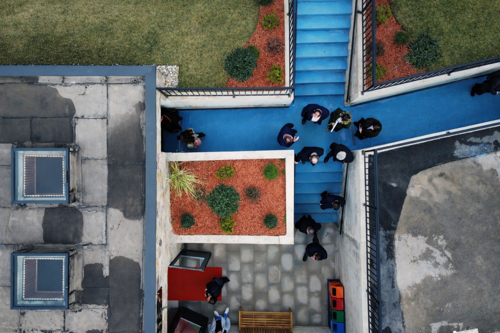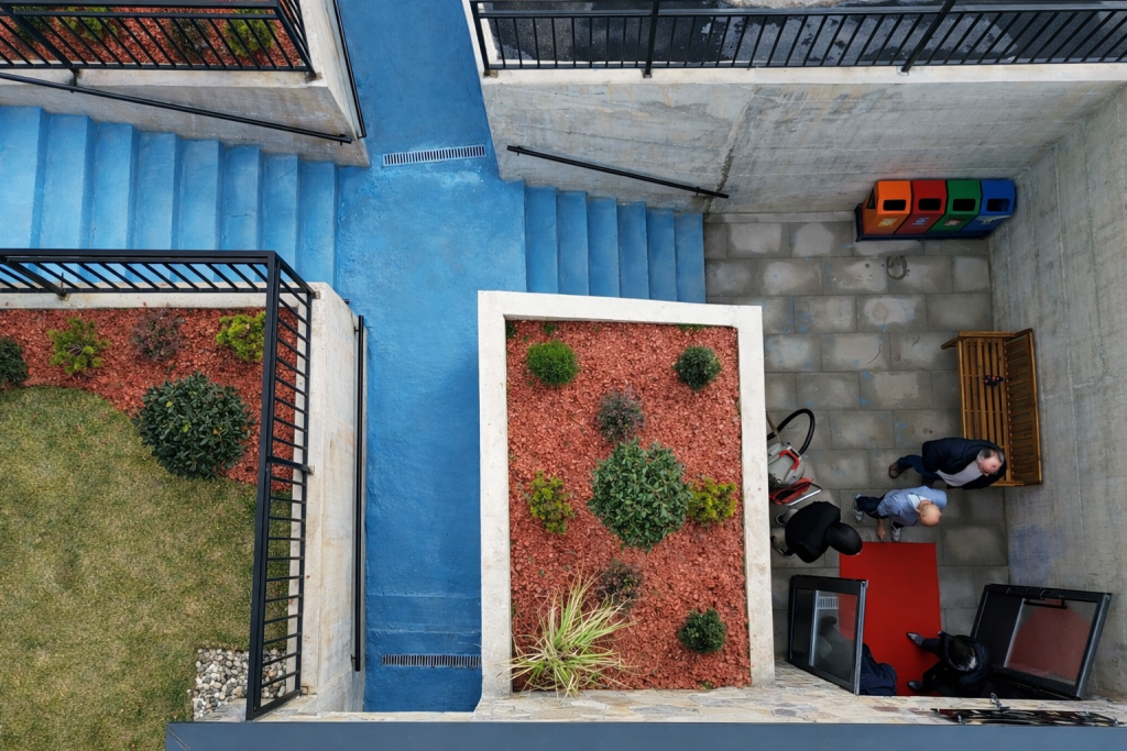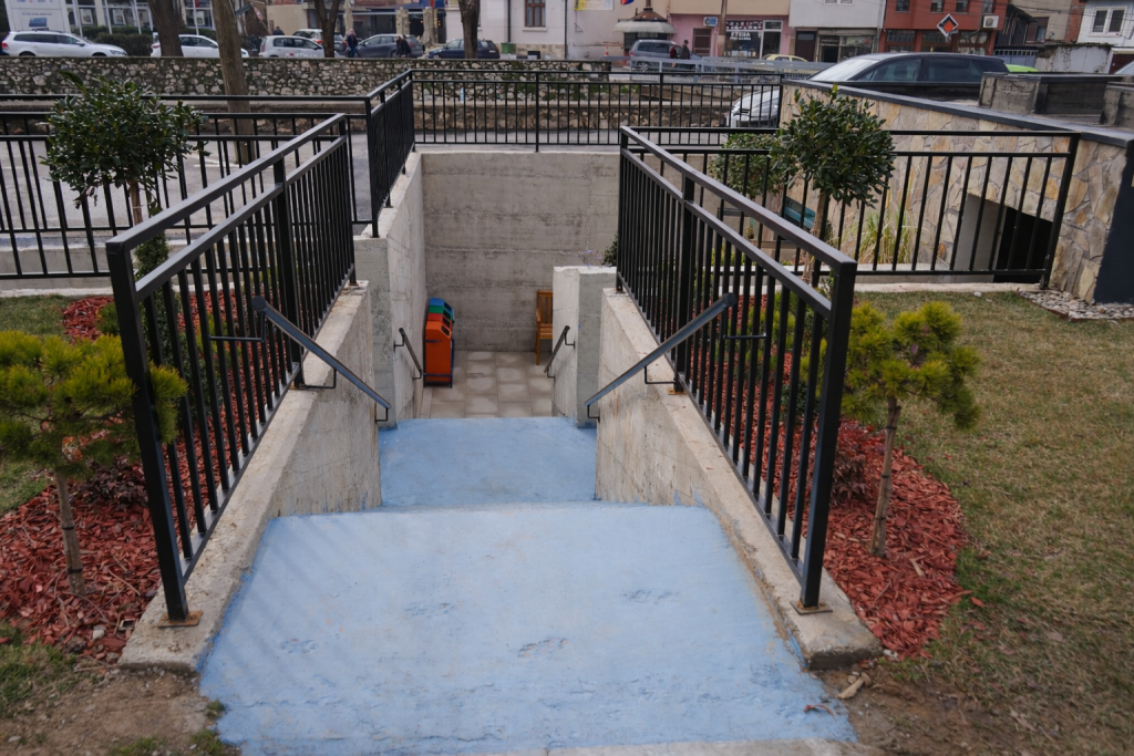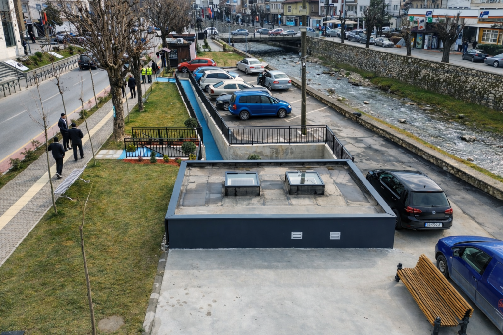 Materiality plays a central role in ensuring durability and long-term performance. Contemporary, high-quality finishes were selected to withstand intensive public use while maintaining architectural clarity. The adjacent ramp, designed fully in accordance with administrative regulations, is marked in blue — a subtle chromatic reference to the Lumbardhi River — establishing a symbolic dialogue between infrastructure and landscape.