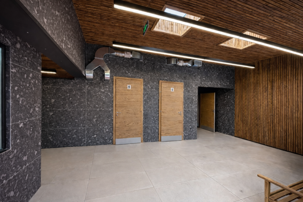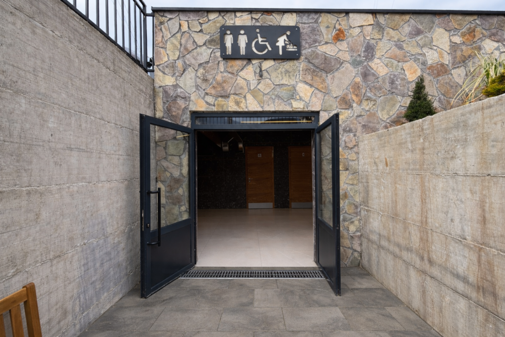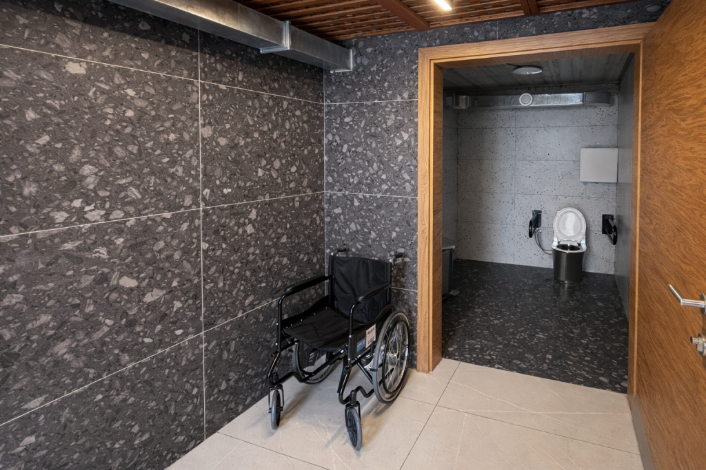 Programmatically, the facility is organized around inclusivity and social equity. Separate sanitary units for women and men are complemented by an accessible toilet for persons with disabilities, positioned directly opposite the foldable platform to ensure clear and dignified access. Between the women’s and men’s sections, a dedicated baby-care room is introduced as a shared space, intentionally redistributing caregiving responsibility and reinforcing principles of gender equality within public infrastructure.